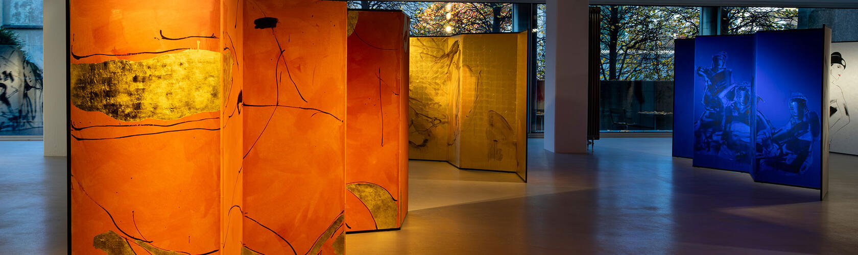 Throughout the exhibition, Japanese references serve less as acts of citation than as tools through which the artist reinvents himself. Scattered across the next room are eight large folding screens (The Japanese Paravents – Byōbu, 2024–25), commissioned specifically for the show. Their monumental structures were crafted in Tokyo and later mounted with over 90 of Castelli’s abstract works, rising taller than a human figure and spanning several metres in width. Painted in broad, gestural strokes on silk and Japanese paper, they emanate intense orange, yellow-gold and cobalt blue, offset by stark black and white. Known as byōbu (wind walls), these objects historically served to divide rooms and spaces; here they emerge as carriers of evocative compositions that unfold across multiple panels.