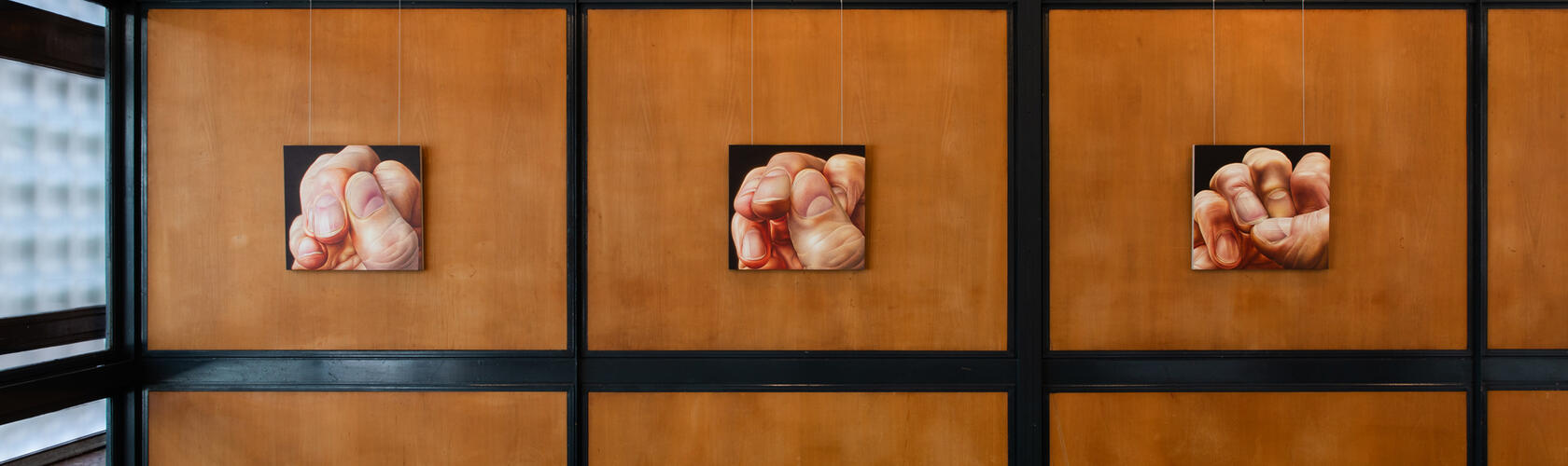 This duality is most visible in Probe (1), (2) and (3), part of an ongoing series depicting entangled fingers. The nails appear buffed, almost polished, whilst the surrounding skin is rough and coarse. The juxtaposition exposes the sensual yet unsettling aspects of the body and its strange protective measures: fingernails are a shell to the fingertips; a device with which to pick. In these works, obsession is mediated through repetition as the artist’s preoccupation with hands becomes addictive, exaggerated far beyond familiarity. Hands become inflated sites of anxiety and a subject – as their titles suggest – for study.