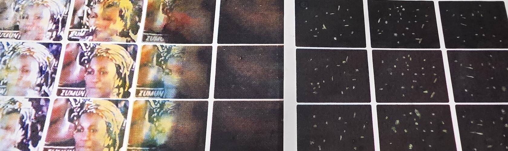 I apply a CMYK silk screen to parts of the photograph, I paint parts, and I use the Maillard process of the coconut milk on other parts. Even the CMYK is imperfect and the colours are all wrong. They look nothing like how they look in the photograph. The painting comes in and starts commenting on the peculiarity of the applied material.